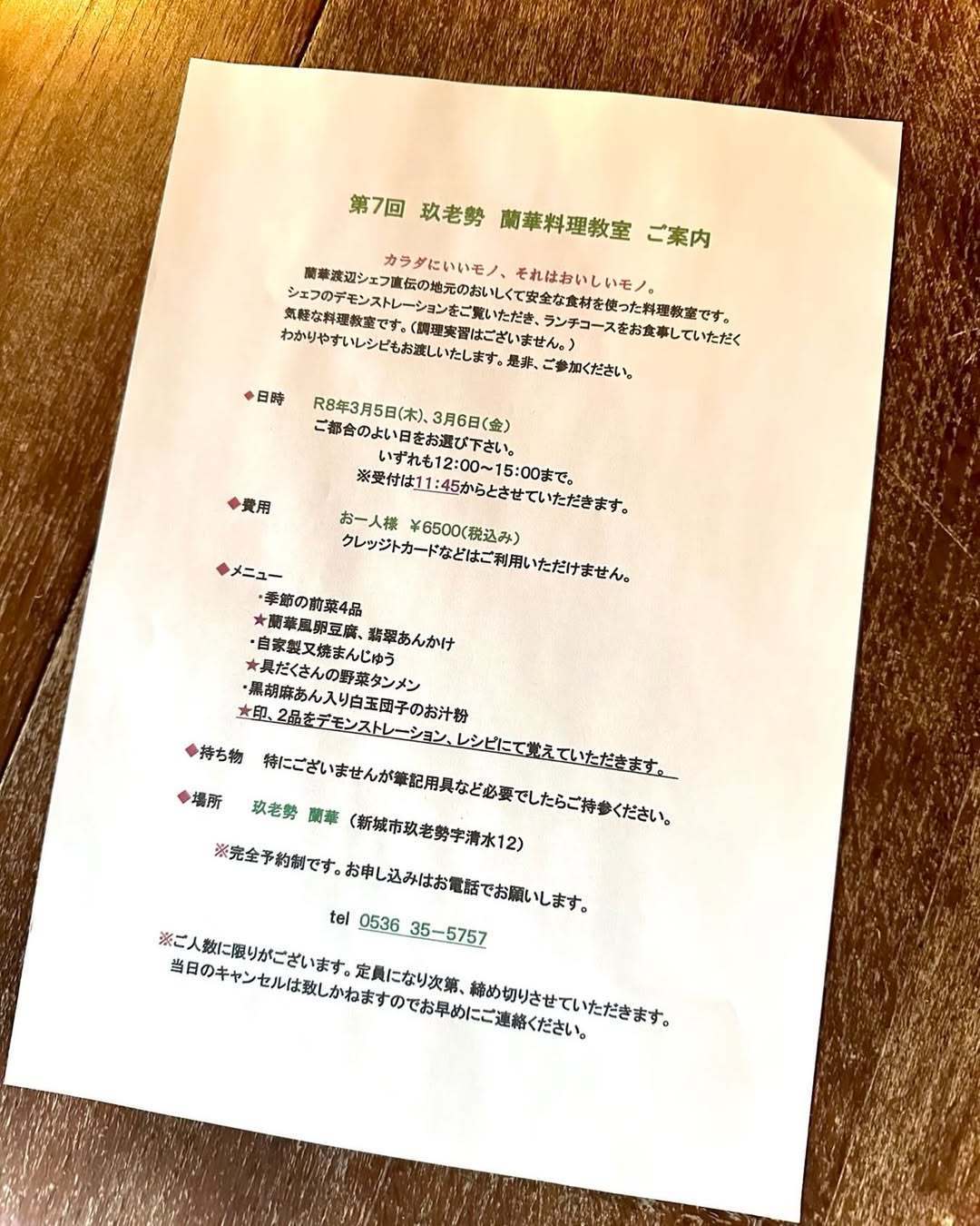 - * 当日のキャンセルや人数の変更につきましては、お料理の準備の都合上、キャンセル料としてお食事代の全額を頂戴する場合がございます。